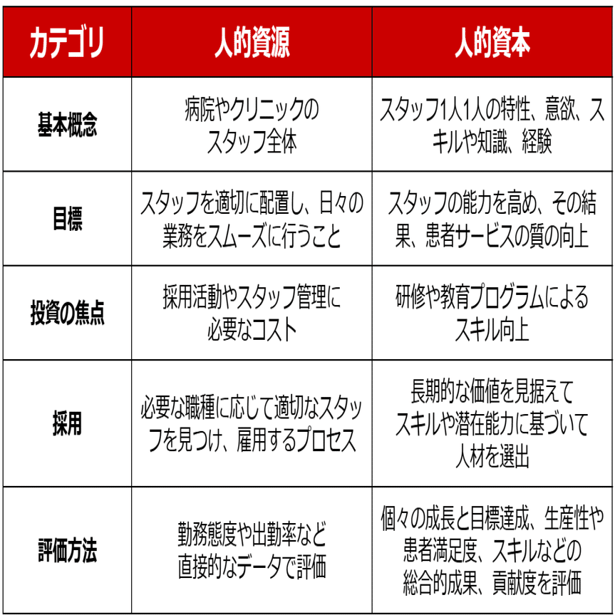 下表にヒトを資源としてみる視点と資本としてみる視点の比較をまとめております。