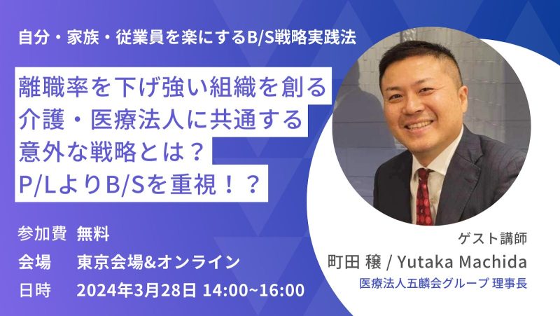 ●講演テーマ:『離職率を下げ強い組織を創る介護・医療法人に共通する意外な戦略とは?P/LよりB/Sを重視!?』