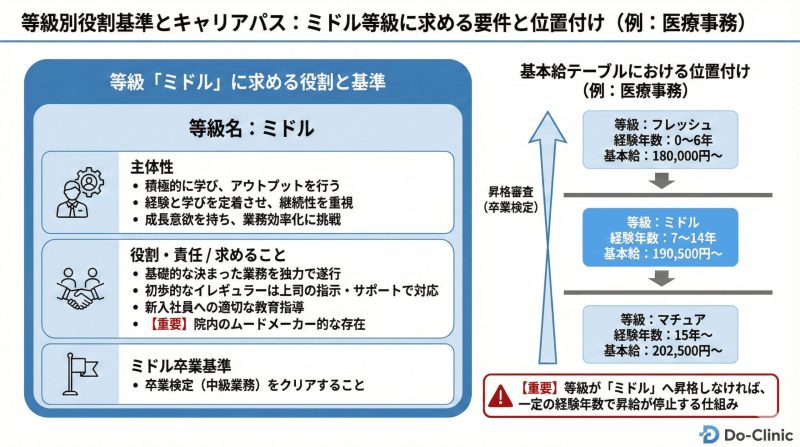 基本給テーブルは、経験年数だけでなく、クリニックが求める役割(等級)と連動させました。